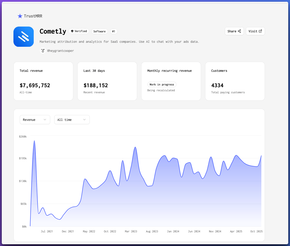 Cometly is at the top of the list of Startups with Stripe verified revenue.